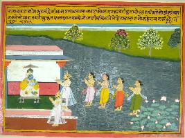 | Description / विवरण | Miniature painting based on Krishna avatar charit Krishna is shown in a structure in the middle of river and a king and four sages coming to pray Krishna. |