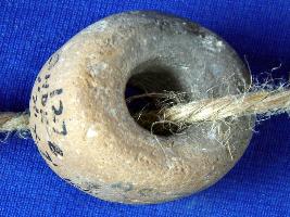 | Description / विवरण | Terracotta bead with a large perforated hole in the centre. It is bi-convex in shape. One side is higher that the other and has curvilinear designs. |