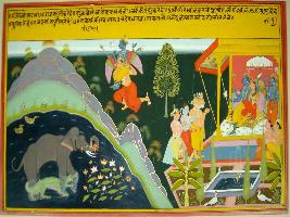 | Description / विवरण | Miniature painting based on Gajendramoksha depicting Gajendra standing in the clutches of a crocodile and holding a lotus by his trunk and praying for Lord Vishnu. At the left part, Lord Vishnu is shown seated with Goddess Lakshmi on a throne and Brahma, Shiv and Indra are shown praying to him. At the upper middle part, Vishnu is shown riding on the shoulders of Garuda to come and save the elephant. |