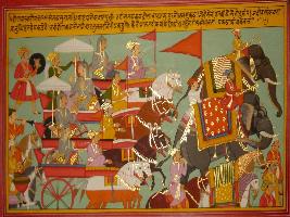 | Description / विवरण | Miniature painting based on Mahabharat - Drona parva depicting Sanjay narrating the war to Dhritrashtra and says that as Duryaudhan made Drona commander of kuru army, Drona ask Duryodhan what he want from him to do. Then Duryodhan ask him to imprisoned yudhistir. Then Drona replied that as long as Arjun will be with Yudhisthir he can t imperison Yudhisthir. |