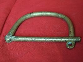 | Description / विवरण | It is a hand cuff in D shape made up of brass. It is plain with a semi circular band attached with a stick D shape and the holes at the corners can be seen. |