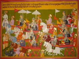 | Description / विवरण | Miniature painting based on Mahabharat - Drona parva depicting that one messenger informed Yudhisthir about the plan of Drona to catch him. Then Yudhisthir says it to Arjun and Arjun replied that Devtas like Indra could not defeat him. then how would Drona defeat him. By saying this Arjun starts fighting. |