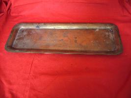 | Description / विवरण | A rectangular brass tray having curved corners. It has plain surface from both the sides no design pattern . It has black spots which can be seen all over the tray. |