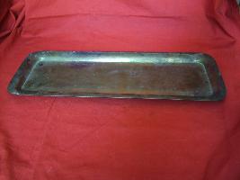 | Description / विवरण | A rectangular brass tray having curved corners. It has plain surface from both the sides no design pattern . It has black spots which can be seen all over the body of the tray. |