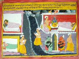 | Description / विवरण | Miniature painting based on Harivansha depicting the birth of Krishna. Vasudev and Devki are seen praying and he takes birth. At night, Vasudev takes him to Yashoda when the demon guards are sleeping outside the prison. He exchanges Krishna with the daughter of Yashoda and goes back. Nand is seen sleeping below. |