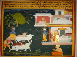 | Description / विवरण | Miniature painting based on Krishna charit - Sur Sagar depicting Rag Malhar, ragini of Rag Megh. Krishna is depicted with his friends, bringing back cows in one side, on the other side Krishna is depicted talking to woman in a house. On the lower part Surdas is depicted. |