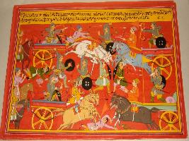 | Description / विवरण | Miniature painting based on Mahabharat - Drona parva depicting the fight between Bhim and Bibesati, First Bhim attacked him with arrows then Bibesati cut the bow and flag of Bhim then Bhim starts fighting with mace and killed the chariot driver of Bibesati. Then Bibesati also got down from chariot and starts fighting with mace. |