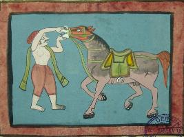 | Description / विवरण | Painting from illustrated manuscript - Shali hotra granth depicting a brown coloured horse with a man, the horse is fully harnessed and the man is depicted opening the mouth of the horse. This manuscript contains 24 pages and 35 illustrations. |