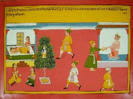 | Description / विवरण | Miniature painting based on Mahabharat - Vana parva depicting after hearing about Nala from the swan, Damayanti become passionate and his father Bhim started preparing for Sayambhara and sending his messengers after hearing the condition of Damayanti. |