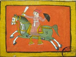 | Description / विवरण | Painting from illustrated manuscript - Shali hotra granth depicting a green coloured horse and a man depicted holding sword 2nd shield and sitting on a horse. This manuscript contains 24 pages and 35 illustrations. |