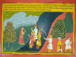 | Description / विवरण | Miniature painting based on Mahabharat - Vana parva. The painting depicts that Damayanti is running in the vana very helplessly than she is meeting the Ktaras who are asking about her. |
