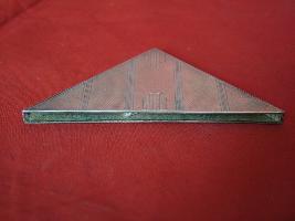 | Description / विवरण | It is a metal object used as corner used at the four ends of the bloting pad. It is made of silver and in triangular shape. It has design on one side and the backside is plain. |
