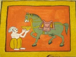 | Description / विवरण | Painting from illustrated manuscript - Shali hotra granth depicting a green coloured horse, fully harnessed, a man is depicted feeding something to the horse. This manuscript contains 24 pages and 35 illustrations. |