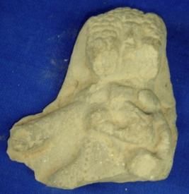 | Description / विवरण | Terracotta female bust, broken below waist. She has elaborate head gear. Her left arm is kept over breast and right arm is spreaded. |