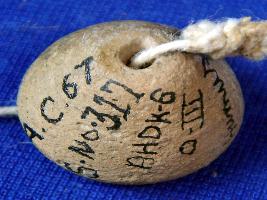 | Description / विवरण | Terracotta bead of bi-convex in shape. There is a large perforated hole in the centre and incised floral designs around it on the both sides. |