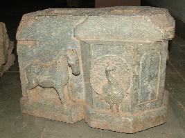 | Description / विवरण | It is a part of door jamb which is decorated with male guard, roaring elephant, dancing peacock and riding horse in high relief. |