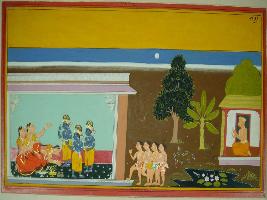 | Description / विवरण | Miniature painting based on Krishna charit - Sur Sagar. On one side under a palatial structure three Krishna is depicted along three women are touching feet of a Krishna, four peoples depicted outside the palace and Surdas is depicted playing Manjeera. |