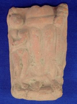 | Description / विवरण | Terracotta female deity in standing position. Only the body below stomach with both palms are visible. She is wearing a drapery. folds of which are prominent. To her right a female attendant is seen in standing position holding something in her hand. |