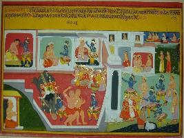 | Description / विवरण | Miniature painting based on Krishna charitra - Sur Sagar depicting Rag Ashwari the Ragini of Rag Shri. The paintings depicting some seen of Mathura that how Krishna the mad elephant, the two wrestler Sonu and Murti, the cloth washer, and how he killed the king Karna and set up Ugrasena on the throne. The painting also depicts the happiness of people of Mathura. |