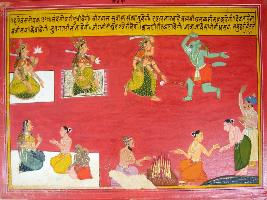 | Description / विवरण | Miniature painting based on Harivansha depicting Devi Parvati in sitting position and fighting with a demon in the left up corner. In the lower side a lady is talking to a Brahman with two boys. Two men are performing yagna. |