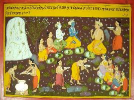 | Description / विवरण | Miniature painting based on Harivansha depicting Krishna and Balram taking meal with a king and his four queens. Many attendants are cooking and serving them. |