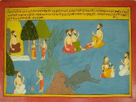 | Description / विवरण | Miniature painting based on Mahabharat - Vana parva depicting Lomash rishi telling king for performing penance in Ekpur for son. This son will be immortal. He later becomes a sinner and a sage gave curse to him. Them he prays the sage for mercy. |