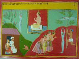| Description / विवरण | Miniature painting based on Mahabharat - Adi parva depicting at the upper centre, a sage talking to a king. The lower right part depict parent watching their child. At the lower left a man shaking the tree where the sage is pictured and three king praying the sage. |