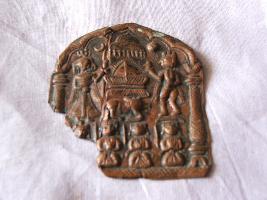 | Description / विवरण | This is a copper plate having Shiva linga and Nandi figure. An umbrella Chhatra is depicted over Siva linga, two attendants are worshipping the Siva linga. In the lower part three gods are in sitting posture. There is an arch pattern decoration. |