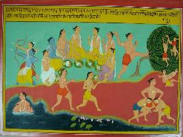 | Description / विवरण | Miniature painting based on Mahabharat - Adi parva depicting the Kauravas and Pandavas in the time of their Gurukul where all of them are taking meal. On the other hand Bhim is seen punishing the Kauravas by throwing them from trees and at the time of playing wrestling. |
