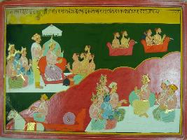 | Description / विवरण | Miniature painting based on Mahabharat - Sabha parva depicting fore fathers of Pandavas. Harish chandra is depicted sitting in court of Indra with Pandu, Narad is seen talking to king and leaving in viman to participainting in yagna. Yudhisthir is seen sitting with Pandavas and his ministers. |