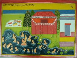 | Description / विवरण | Miniature painting based on Mahabharat - Adi parva depicting a bath seen of princes a Kauravas and Pandavas Hastinapur in the lake while their cloth and camp are seen on top. |