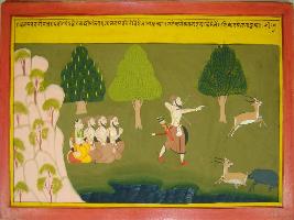| Description / विवरण | Miniature painting based on Mahabharat - Vana parva. One of Pandavas is depicted hunting a deer and the other Pandavas depicted sitting with Draupadi. A beer also depicted following a deer. |