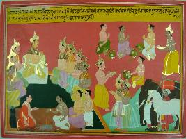 | Description / विवरण | Miniature painting based on Mahabharat - Sabha parva depicting Yudhisthir is asking that in king Harishchandra s court who is the main person. Then he says that king Sukresu is the main person. |
