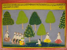 | Description / विवरण | Miniature painting based on Mahabharat - Vana parva depicting Pandavas are moving from different countries, reaches besides river Saraswati. There they saw sages performing penance and different kinds of trees. They sat over there to take rest. |