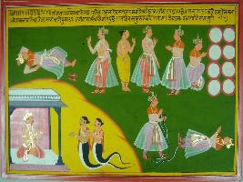 | Description / विवरण | Miniature painting based on Mahabharat - Adi parva depicting that Bhim is in Nag van and Bhim is meeting with Vasuki Naga. |
