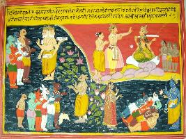 | Description / विवरण | Miniature painting based on Harivansha depicting Brahma blessing demons in the right side. In the other side Indra along with a priest ask the devi for help. In the lower part of painting, Vishnu is talking with a devi and the demons are lying dead. |