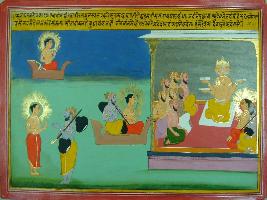 | Description / विवरण | Miniature painting based on Mahabharat - Sabha parva depicting surya in the disguise of a man coming to earth and describe about the court of Brahma. The painting also depicts surya with Narad come to meet Brahma. Many other sages are also sitting with Brahma. |