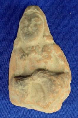 | Description / विवरण | Terracotta female figurine in seated position holding something in his both hands. She is wearing an elaborate headgear and adorned with jewels. |