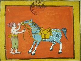 | Description / विवरण | Painting from illustrated manuscript - Shali hotra granth depicting a horse with blue colour and white dots and a man checking the horse and feeding the horse. This manuscript contains 24 pages and 35 illustrations. |