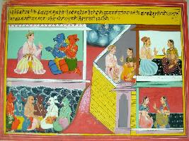 | Description / विवरण | Miniature painting based on Harivansha depicting Maharaja Kanisha talking with two demons in the right up corner. Again six demons are seen in the lower right corner that they are going to pataal. In the left side Vasudev and Devki are seen in the palatial balcony. While Vishnu is seen in the upper centre. |