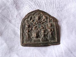 | Description / विवरण | This copper plate has depiction of four-handed Lord Vishnu carrying conch and lotus in Dhyana mudra with four attendants |