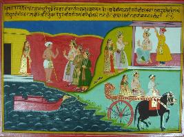 | Description / विवरण | Miniature painting based on Mahabharat - Adi parva depicting Bhishma coming to the house of Kewat and asked him to give hand of his daughter to Shantanu. He asked Bhishma to make a pledge to remain unmarried. He pledge and took Satyavati to the Shantanu. |