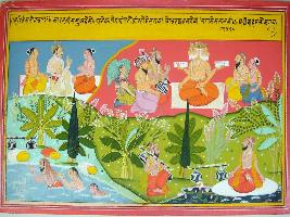 | Description / विवरण | Miniature painting based on Harivansha depicting Kansa is seated in between two Narad. In left top Brahma is presiding musicians, angel etc. Some sages are bathing into river. |