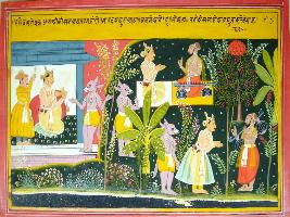 | Description / विवरण | Miniature painting based on Harivansha depicting arrival of Narad Muni in Mathura. He sent his messenger to Kansa and is shown at right side. To its left, Kansa is show with messenger, folding hand in front of Narad. Above this scene, king Kansa is shown sitting with Narad and performing prayer, and Narad s messenger is standing nearby Kansa. |