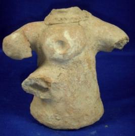 | Description / विवरण | Terracotta female figurine. The head and left arm are broken. It is hollow from inside and wearing a necklace. |
