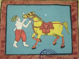 | Description / विवरण | Painting from illustrated manuscript - Shali hotra granth depicting a yellow coloured horse, fully harnessed and a mans is depicted in front of the horse checking the horse. This manuscript contains 24 pages and 35 illustrations. |