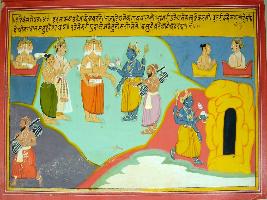 | Description / विवरण | Miniature painting based on Harivansha depicting the story of Krishna-Avatar . Lord Vishnu is standing with Lord Brahma, Indra and Narad muni. At the left side of the painting Lord Vishnu is entering in a cave and other figures are depicted in the other corners. |