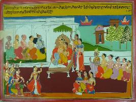 | Description / विवरण | Miniature painting based on Mahabharat - Sabha parva depicting Indra is sitting with Indrani and all sages at court and watching dance. |