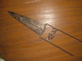 | Description / विवरण | It is a katar of Kota. It is pointed at top. It has both side sharp. It is like as Bhala throwing katar . The hilt holding part is rectangular in shape. It has only joined two vertical thin rod near the base. Palm pan like decorative motive also carv |