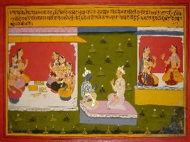 | Description / विवरण | Miniature painting based on Mahabharat - Ashwamegh parva depicting Pandavas with Kunti and Draupadi meeting Krishna, Yashoda, Devki and Rukmani. Yudhisthir with rest of Pandavas touches feet of Devki. Krishna is depicted sitting with Yudhisthir at lower middle part. At the extreme left, Draupadi is shown talking to Rukmani and other queens. At the right, all women are shown taking food. |